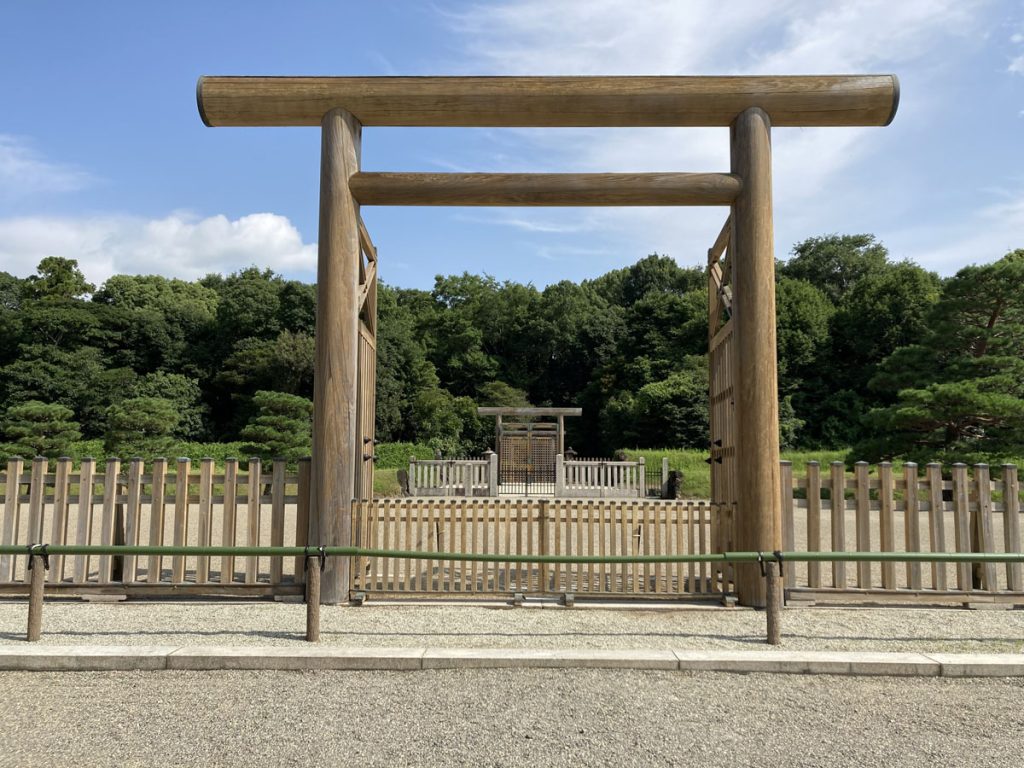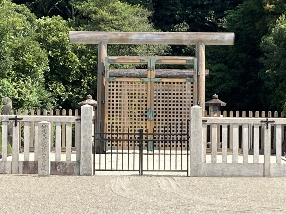 神武天皇は畝傍山(うねびやま)の北東の麓に葬られた、との記録があり、それに基づいて、江戸時代になってから治定されたのが、この神武天皇陵です。御陵(ごりょう、天皇のお墓)も神社と同じく二拝二拍手一拝でお参りします。