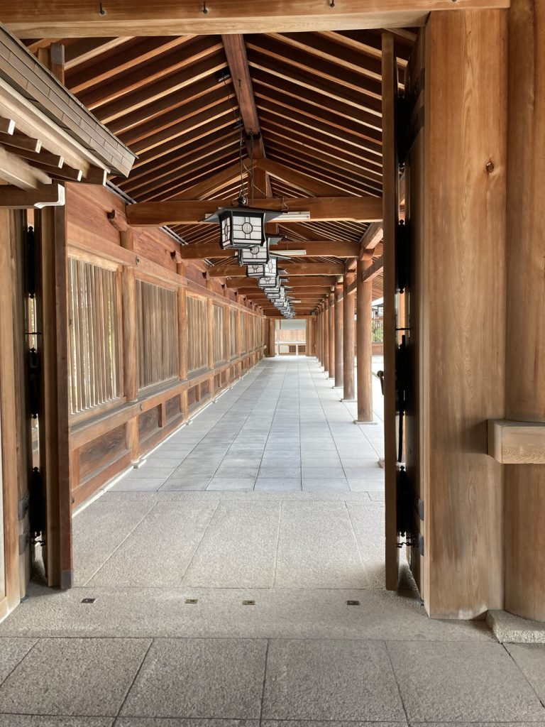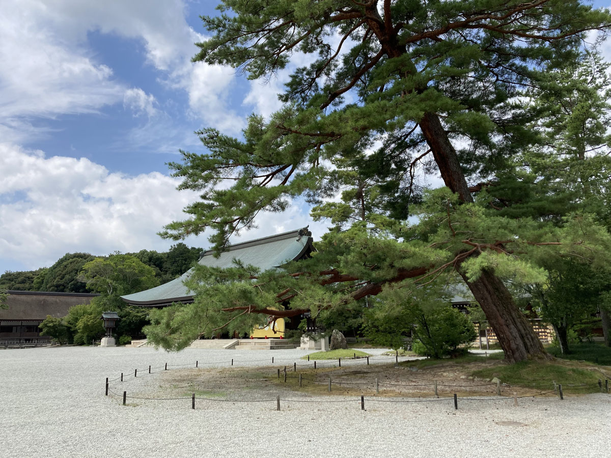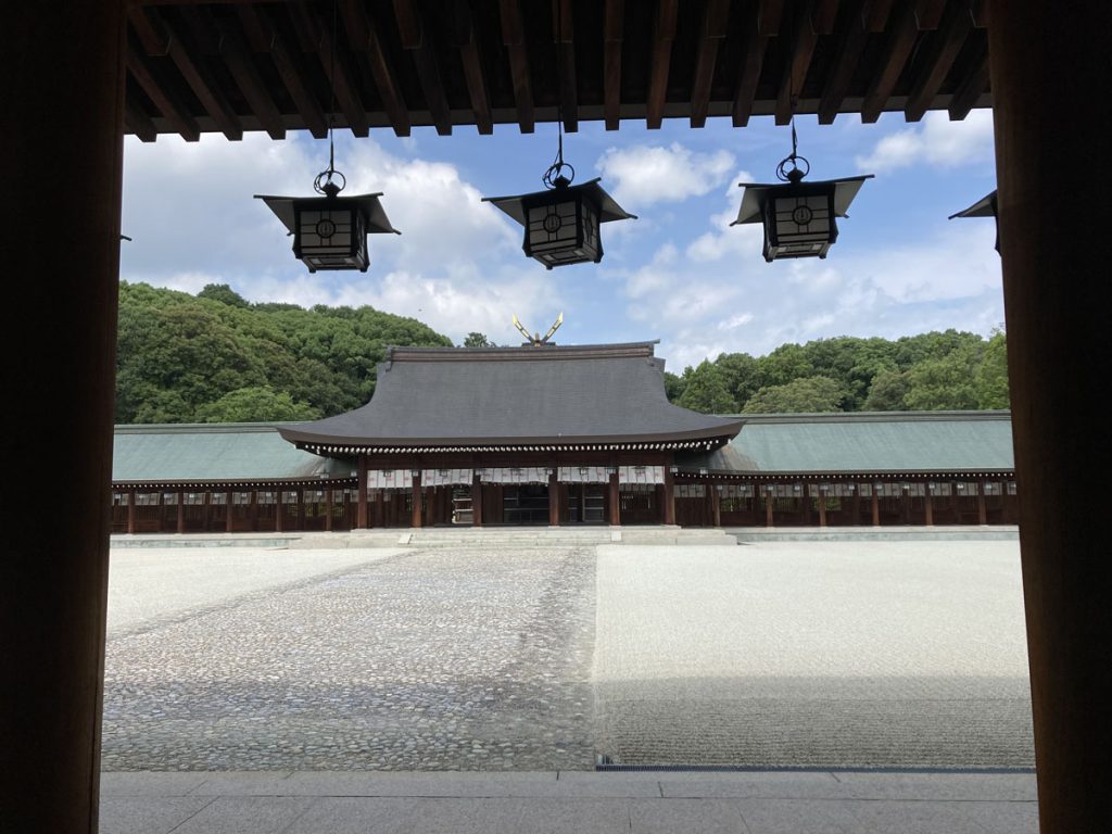 橿原神宮の宝物殿は、拝殿や本殿とはだいぶ離れたところにあります。神武天皇の絵―勾玉の首飾りをかけ、弓矢を携え、頭椎の太刀(かぶつちのたち)という特徴的な太刀を佩く姿は迫力があります。群馬県の遺跡から出土したという頭椎の太刀の実物もとてつもない長さがあり、ド迫力でした。