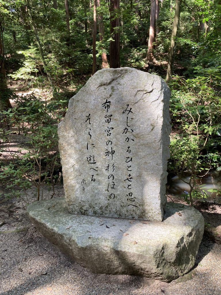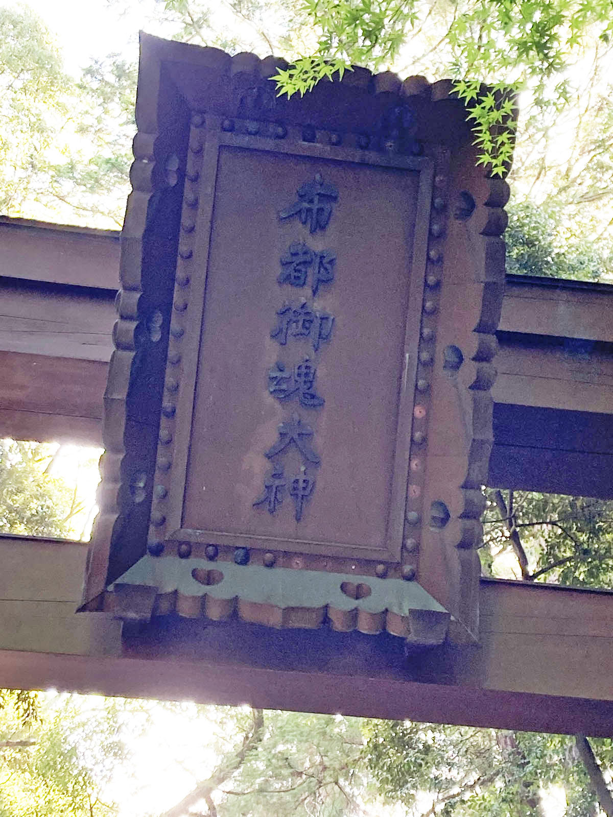 鳥居の扁額の文字は「ふつのみたまのおおかみ」と読み、石上神宮のご祭神です。ふつのみたま( 韴霊 とも、 布都御魂 とも書きます)は、神武天皇の東征を助けた神剣であり、その霊威を称えて神様として祀っています。